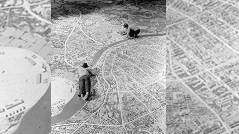 فۆتۆگرافەر ئەلفڕێد ئایزنستاد ئەم وێنە ئایكۆنییەی لە ساڵی ١٩٣٩ گرتووە، كە دوو پیشەوەر نیشان دەدات كە كار لەسەر مۆدێلی گەورەی "فوتوراما" دەكەن كە لەلایەن نۆرمان بێل گێدێسەوە بۆ پێشانگای جیهانی نیویۆرك دیزاین كراوە، ئەم شاكارە ئەندازیارییە كە لەلایەن كۆمپانیای جەنەراڵ مۆتۆرزەوە پێشكەشكرا، دیدێكی بوێرانەی داهاتووی بەرجەستە كرد، پڕۆژەكە مۆدێلێكی قەبارەیی "شاری داهاتوو" بوو وەك ئەوەی دیزاینەر نۆرمان بێل گێدێس پێشبینی كردبوو،مەبەست لێی خستنەڕووی دیدگایەكی بوێرانەی ژیان بوو لە ئەمریكا .