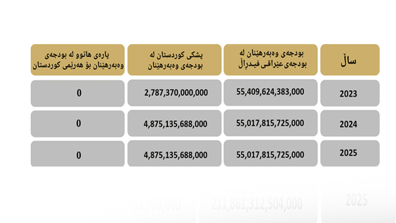 لەدوای پەسەندکردنی یاسای بودجەی گشتیی فیدڕاڵیی عێراق لە 21ـی حوزەیرانی ساڵی 2023 کە بۆ هەر سێ ساڵی دارایی (2023 – 2024 – 2025) لەخۆ گرتبوو، تیایدا پشکی هەرێمی کوردستان دوای چەندین گفتوگۆ و لێکتێگەیشتن لەنێوان شاندی حکومەتی هەرێمی کوردستان و حکومەتی فیدڕاڵیی عێراق، ئەم یاسایە پەسەند کرا، لە یاساکە پشکی هەرێمی کوردستان دیاری کراوە بە مەرجی ناردنی داهاتی نانەوتی بە گوێرەی یاسای بەڕێوەبردنی دارایی و پێدانی نەوتی بەرهەمهێندراو بە کۆمپانیای بەبازاڕکردنی نەوتی عێراق (سۆمۆ) یاخود وەزارەتی نەوتی عێراقی فیدڕاڵ، لەبەرامبەر ئەمەشدا حکومەتی فیدڕاڵیی عێراق، دەبێت پشکی هەرێمی کوردستان خەرج بکات بەگوێرەی یاسای بودجەی گشتیی فیدڕاڵی، بەڵام لە تەواوی ئەو سێ ساڵەدا ئەو بڕەپارەیە بۆ هەرێمی کوردستان نەنێردراوە کە لە یاسای بودجە دیاری کرابوو.(خشتەی1)