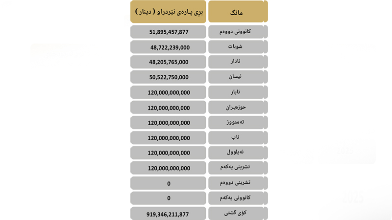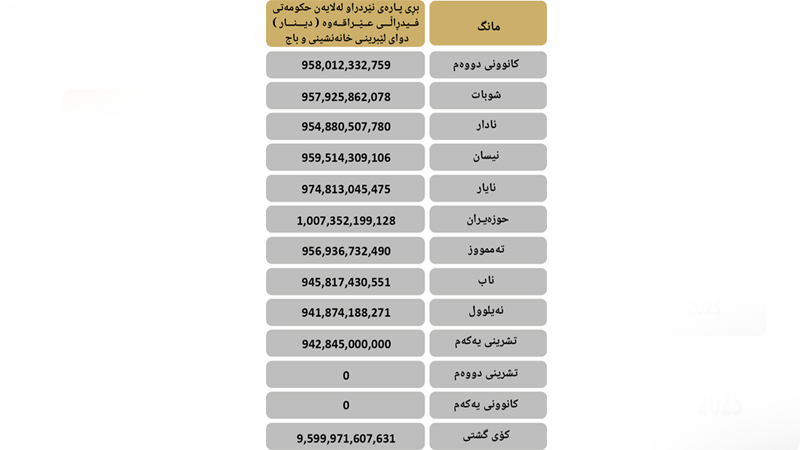وردەکاریی پارەی نێردراو لەلایەن حکومەتی فیدڕاڵیی عێراقەوە بۆ حکومەتی هەرێمی کوردستان لە ساڵی 2025
