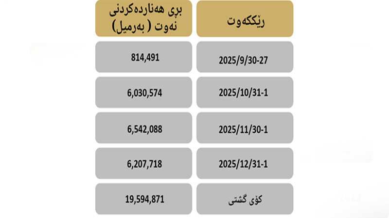 وەك لە خشتەکەی سەرەوەدا ئاماژەی پێکراوە، لە ماوەی 95 ڕۆژی کۆتایی ساڵی 2025ـدا، بە تێکڕا، ڕۆژانە زیاتر لە 206 هەزار بەرمیل نەوتی هەرێمی کوردستان، لە ڕێگەی کۆمپانیای بەبازاڕکردنی نەوتی عێراق (سۆمۆ) هەناردە کراوە.