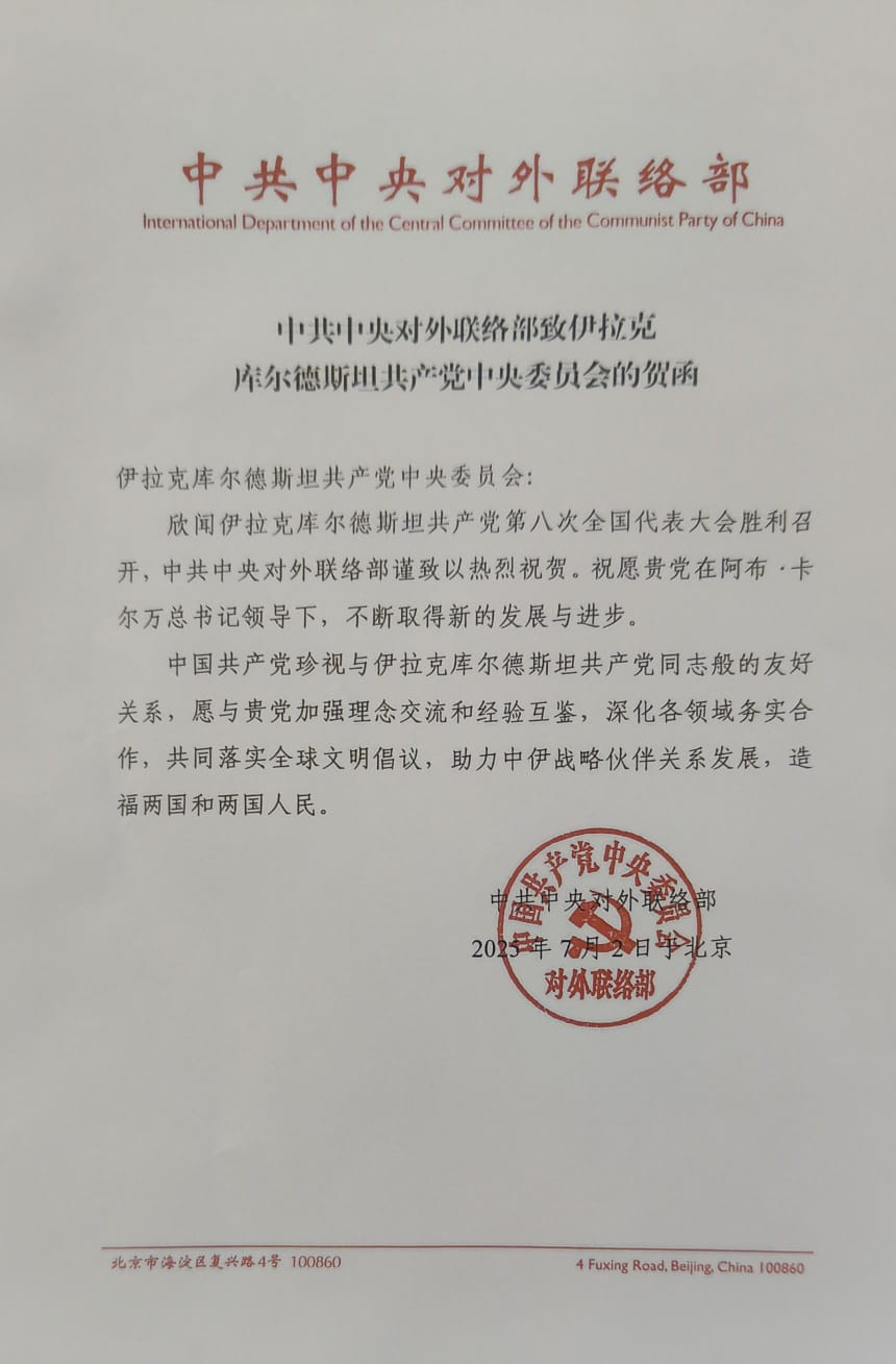 بە خۆشحاڵییەکی زۆرەوە هەواڵی بەڕێوەچوونی سەرکەوتووانەی هەشتەمین کۆنگرەی نەتەوەیی حزبی شیوعی کوردستانی عێراقمان پێگەیشت. بەشی پەیوەندییەکانی دەرەوەی کۆمیتەی ناوەندی حزبی شیوعی چین پیرۆزبایی گەرم ئاراستەی حیزبە بەڕێزەکەت دەکات، هیوای پێشکەوتنی زیاتری حزبەکەتان بە سەرکردایەتی سکرتێری کۆمیتەی ناوەندی هاوڕێ ئەبو کاروان دەخوازین.