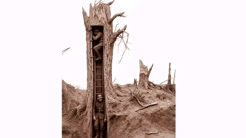 ئەم دارە لە نزیك خەندەقەكان دروست دەكرا، ئامانج تیایدا شارنەوەی سەربازێك بوو لەناو توێكلی كانزاییەكەیدا، ئەمەش ڕێگەی بە چاودێریكردنی وریاییترین جووڵەی دوژمن دەدا، ئەم دارە ساختەیە دەبوو ئەوەندە قەناعەت پێكەربێت كە هیچ گومانێك نەوروژێنێت بۆیە لە تاریكیدا، بە دارە سروشتییەكە جێگەی گرتەوە، ژاوەژاوی دەوروبەر وەكو فێڵێكی زیرەك بەكاردەهێنا، ئەم دارە فریودەرە كاتێك لە شوێنی خۆیدا بوو، بەبێ كێشە تێكەڵ بە دیمەنە جەنگاوەرەكان بوو، خاڵێكی چاودێری شاراوەی بۆ سەربازەكان دابین دەكرد.