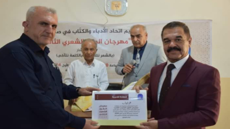 بەئامادەبوونی سەرۆکی لقی پارێزگای سەڵاحەدینی یەکێتی نووسەران وئەدیبانی عێراق وژمارەیەکی زۆر لە شاعیران وئەدیبانی شاری کەرکوک وخورماتوو . کۆڕێک بۆ شیعر خوێندنەوە لە هۆڵی کتێبخانەی گشتی لە شارەکە بەڕێووە چوو .