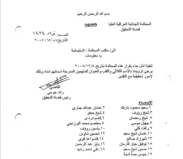 هەروەها "لە رێكەوتی 21-12-2005, بە پێی نوسراوی دادگای باڵای تاوانەكان ژمارە ف2 1474, داوای ناوی سیانی و ناونیشانی 18 تاوانبار دەكات كە بریتین لە" سەعید مەحمود باریكە, عەدنان جەباری, شێخ رەئوف, شێخ جەعفەر 164-جعفر عبدالكریم البرزنجی محافز السلیمانیە, شێخ رەمەزان, قاسم دڕەیی, جیهان موسا, معتەسەم بەرزنجی, رەفعەت گلی, یاسین رەئوف, غەسان شێخ سەعید, تەحسین شاوەیس 409-تحسین شاویس سعید , شێرزاد ساڵەح, قاسم ئاغای كۆیە 115-المستشار (قاسم فارس تاهر مصتفی اغا) ف د و /, تۆفیق جەبار قارەمان, بایز عەبدالڕەحمان, حوسێن شێخ سەعید, عەلی ئەحمەد رەشید, حوسێن حەمە ئینجە".